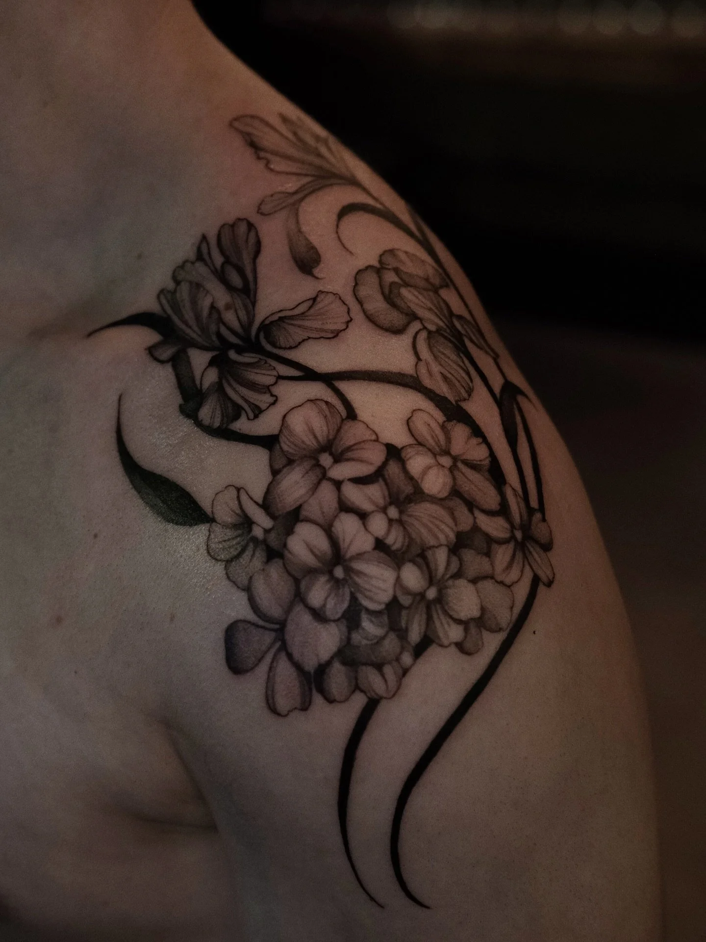 Jodi is the studio’s vibrant spirit and a skilled tattoo artist specialising in soft-shaded black and grey florals, bold blackwork and intricate ornamental designs.